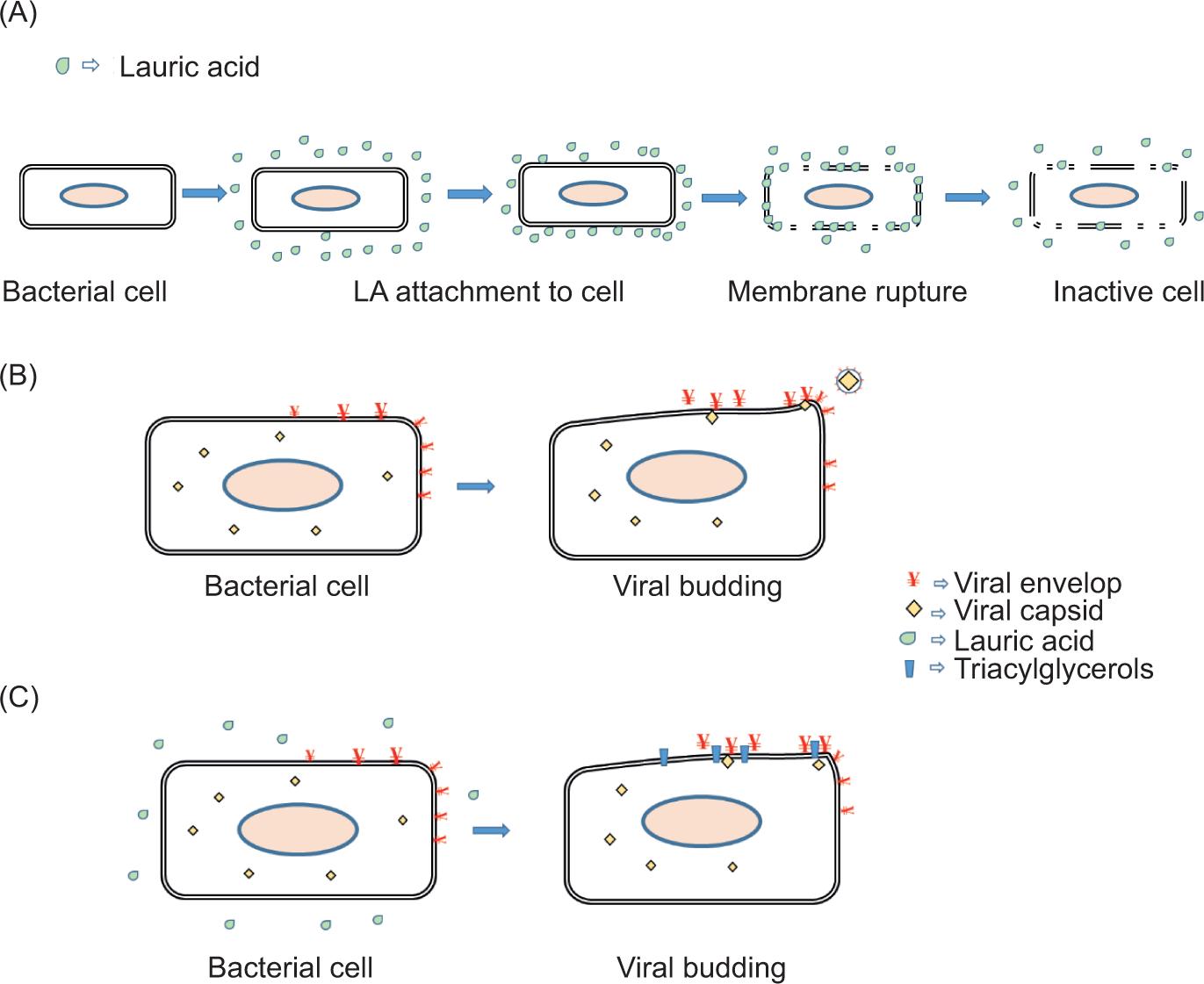 Figure 1. Anti-bacterial inactivation by lauric acid (A), Viral inhibition by lauric acid: viral budding in the absence (B) and in the presence of lauric acid (C).