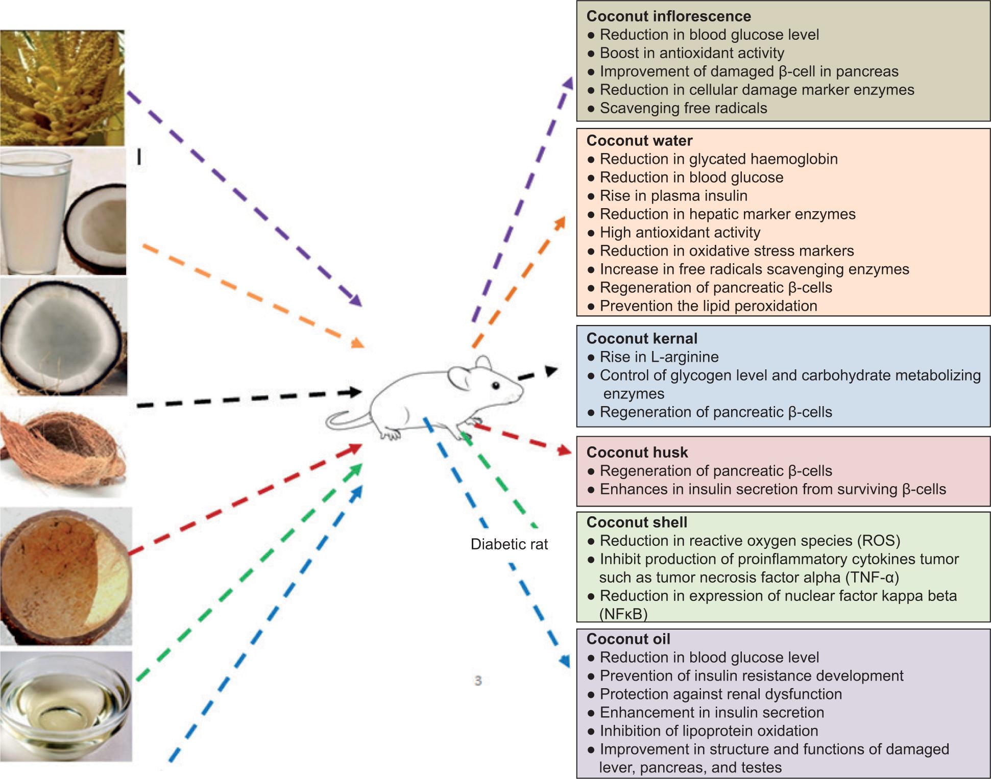 As diabetes is a global health disorder, large-scale investigations are being carried out to develop appropriate drugs that cause hypoglycemia (Ma and Shi, 2021; Zhang et al., 2021). In this context, plant-based antidiabetic products are gaining popularity for various reasons, such as ease of availability, lower costs, and fewer side effects. The various products of coconut, including kernel, coconut oil, coconut water, inflorescence, husk, etc., are utilized for culinary purposes and are also used as traditional medicine for treating several ailments. Owing to its multifaceted properties, the coconut palm is well accepted in Indian medicine and culture. Coconut oil, coconut inflorescence sap, coconut water, coconut kernel, etc., are being used against diabetes-related ailments.