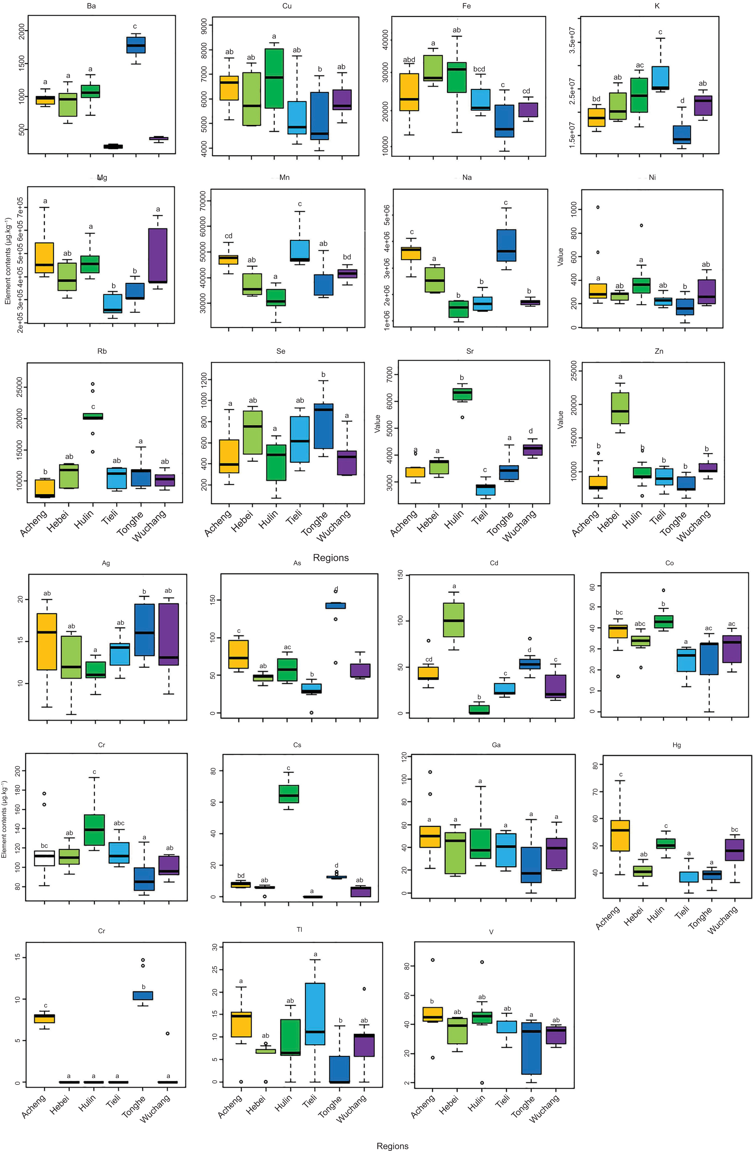 The macroelements (K, Na, Mg, Mn and Fe) and microelements (Rb, Zn, Cu, and Sr ) had the highest concentrations (> 1 mg kg−1) in OR samples from six cities (Table S3). Among these, the Rb content in Acheng, and the Cd, As, and Sr contents in Hulin were significantly lower than in the other cities (p < 0.05). Meanwhile, the Cd and Zn contents in Hebei; Cs, Rb, and Sr contents in Hulin; and As, Ba, and Tl contents in Tonghe were significantly higher than in the other cities (p < 0.05). The Ga content did not differ significantly across all sampling sites.