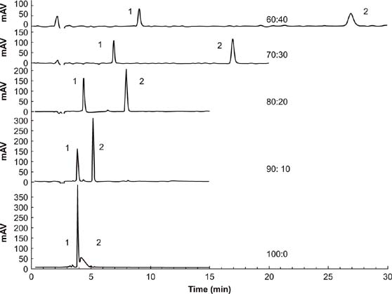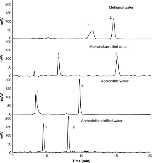 Figure 1. Chromatograms of various mobile phases for the determination of fomesafen (1) and quizalofop-p-ethyl (2). Separation conditions: flow rate = 0.8 mL/min; organic solvent: (acidified) water = 80:20; sample volume = 20 μL; λ = 220 nm.