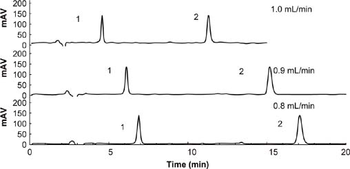 Figure 3. Chromatograms of various flows rated for the determination of fomesafen (1) and quizalofop-p-ethyl (2). Separation conditions: acetonitrile:acidified water = 70:30; sample volume = 20 μL; λ = 220 nm.