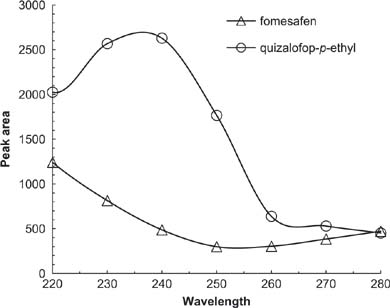 The response results of various wavelength are shown in Figure 4. The peak area response of fomesafen decreased with an increase in wavelength, whereas the peak area response of quizalofop-p-ethyl was always higher. Hence, 220 nm was selected as the detection wavelength at which both fomesafen and quizalofop-p-ethyl were detected sensitively.
