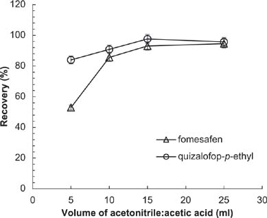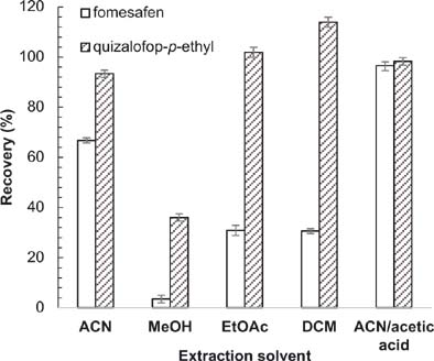 To determine the optimal extractant, five organic solvents, including ACN, MeOH, EtOAc, DCM and ACN:acetic acid (99:1, v/v), were used (Figure 5). Dichloromethane and EtOAc performed efficiently with regard to extraction of quizalofop-p-ethyl but poorly with regard to extraction of fomesafen. Methanol showed the smallest area. Compared with fomesafen, quizalofop-p-ethyl was more sensitive to the acidity and the alkalinity of the solution. Quizalofop-p-ethyl has been reported to decompose easily in an alkaline environment but not in an acidic environment. Therefore, an acidic extraction solution was used. The extraction of quizalofop-p-ethyl by ACN and ACN:acetic acid (99:1, v/v) was similar. In contrast, much better extraction of fomesafen was obtained with ACN:acetic acid (99:1, v/v), compared to ACN. According to the experimental results in Figure 5, the recoveries increased from >60 to >95% after acetic acid was added to the extractant. Thus, ACN:acetic acid was used to extract the analytes.