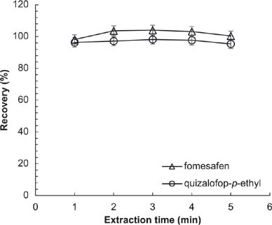 Extraction time should be selected for satisfactory extraction in minimum time. The results (Figure 7) indicated that the recoveries of fomesafen and quizalofop-p-ethyl were approximately constant with extraction time. Given that the extraction time was not an influential variable, and considering sufficient extraction and time saving, 2 min was selected as the best time.
