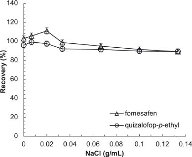 Figure 8. Effect of NaCl on recovery of analytes. Conditions: flow rate = 1 mL/min; acetonitrile (ACN):acidified water = 70:30; sample volume = 20 μL; extraction solvent = 15 mL ACN:acetic acid (99:1, v/v); extraction time = 2 min; absorbent = 12.5 mg C18 + 12.5 mg PSA.