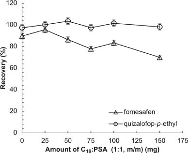 The amount of adsorbent was studied as well (Figure 10). With an increase in the amount of mixed adsorbents C18:PSA (1:1, m/m), there was a decrease in the recovery of fomesafen (suggesting increased adsorption of fomesafen onto mixed adsorbents). Impurities cause unclear chromatograms when adsorbent is not used. Therefore, in order to achieve appropriate purification without affecting the recovery rate, 25 mg of mixed absorbent (C18:PSA) should be used.