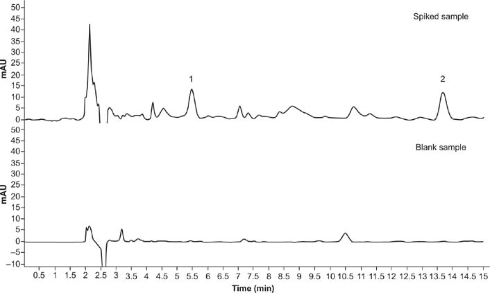 Figure 11. Chromatograms of spiked and blank samples (1 is fomesafen and 2 is quizalofop-p-ethyl). Conditions: flow rate = 1 mL/min; acetonitrile (ACN):acidified water = 70:30; sample volume = 20 μL; extraction solvent = 15 mL ACN:acetic acid (99:1, v/v); extraction time = 2 min; amount of NaCl = 0.3 g; absorbent = 12.5 mg C18 + 12.5 mg PSA.