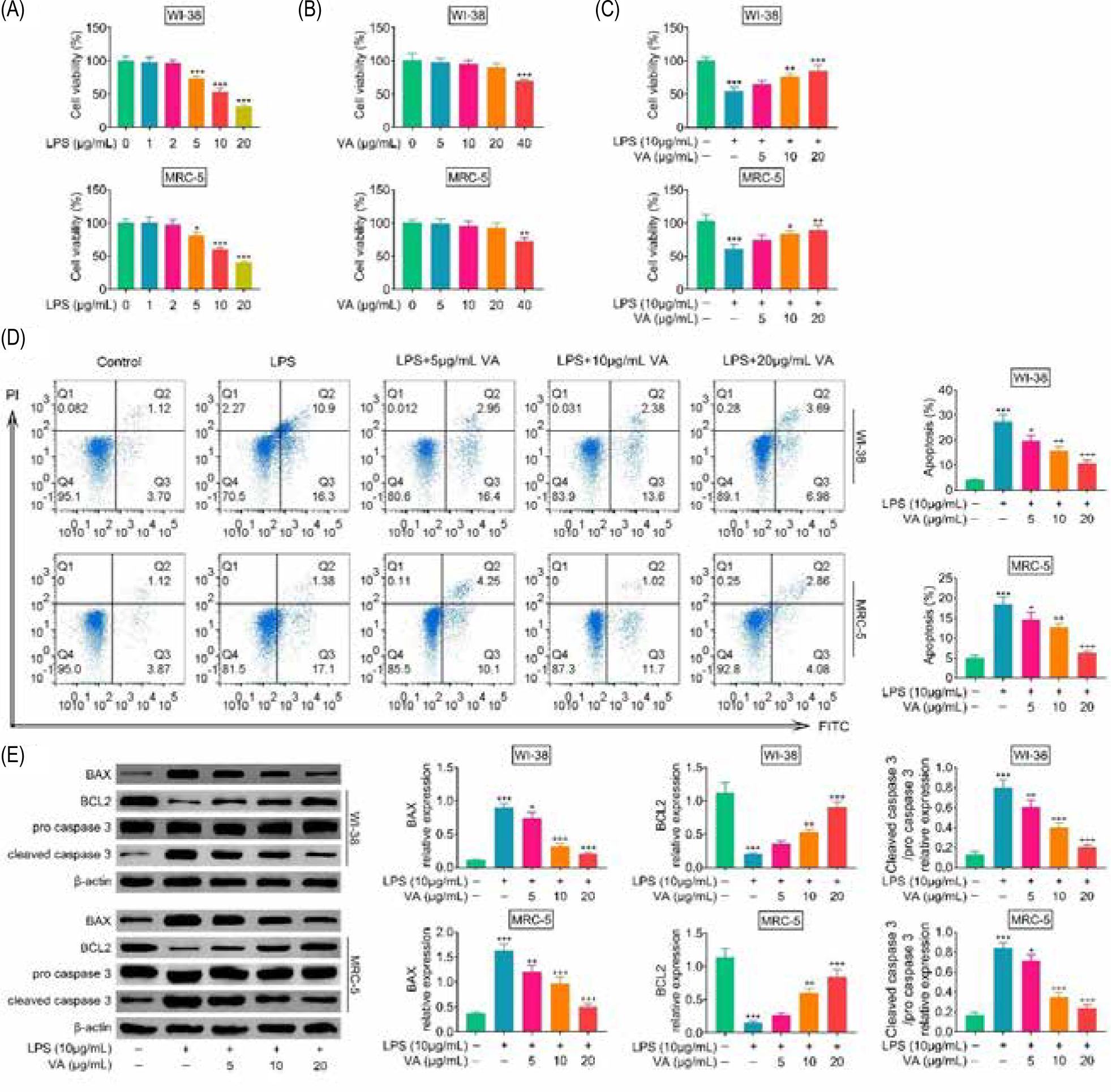 Figure 1. Vanillic acid suppressed cell apoptosis of lipopolysaccharides-treated human lung fibroblasts. (A) Incubation with lipopolysaccharides (more than 2 μg/mL) reduced cell viabilities of WI-38 and MRC-5. (B) Vanillic acid (40 μg/mL) reduced cell viabilities of WI-38 and MRC-5, while vanillic acid below 20 μg/mL demonstrated no significant effect on the cell viabilities of WI-38 and MRC-5. (C) Vanillic acid enhanced cell viabilities of lipopolysaccharides-treated WI-38 and MRC-5 in a dosage-dependent manner. (D) Vanillic acid treatment suppressed cell apoptosis of lipopolysaccharides-treated WI-38 and MRC-5 in a dosage-dependent manner. (E) Vanillic acid treatment decreased protein expression of BAX while increasing BCL2 and cleaved caspase 3 in lipopolysaccharides-treated WI-38 and MRC-5. *P < 0.05, **P < 0.01, ***P < 0.001.