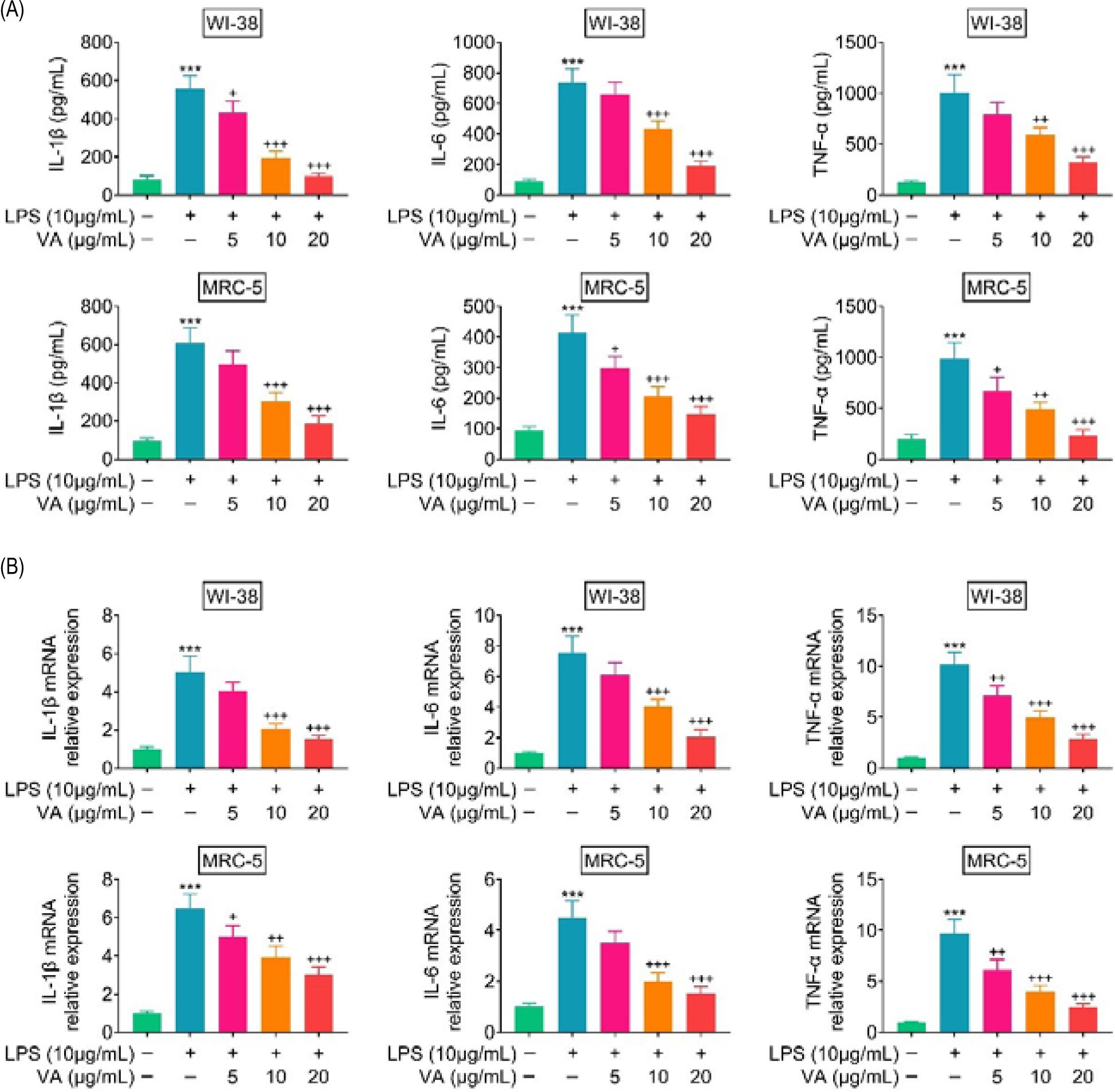 Figure 2. Vanillic acid suppressed inflammation of lipopolysaccharides-treated human lung fibroblasts. (A) Vanillic acid treatment reduced protein expression of TNF-α, IL-6, and IL-1β in lipopolysaccharides-treated WI-38 and MRC-5 in a dosage-dependent manner. (B) Vanillic acid treatment reduced mRNA expression of TNF-α, IL-6, and IL-1β in lipopolysaccharides-treated WI-38 and MRC-5 in a dosage-dependent manner. +P < 0.05, ++P < 0.01, +++, ***P < 0.001.