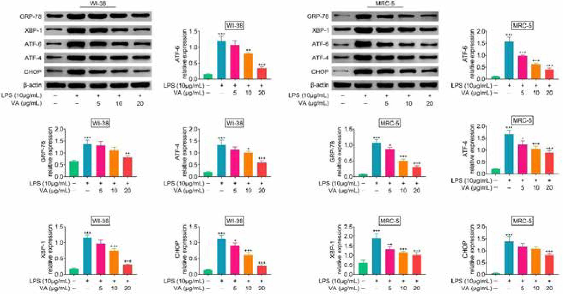 Figure 3. Vanillic acid suppressed endoplasmic reticulum stress of lipopolysaccharides-treated human lung fibroblasts. Vanillic acid treatment reduced the expression of GRP-78, XBP-1, ATF-6, ATF-4, and CHOP in lipopolysaccharides-treated WI-38 and MRC-5 in a dosage-dependent manner. +P < 0.05, ++P < 0.01, +++, ***P < 0.001.