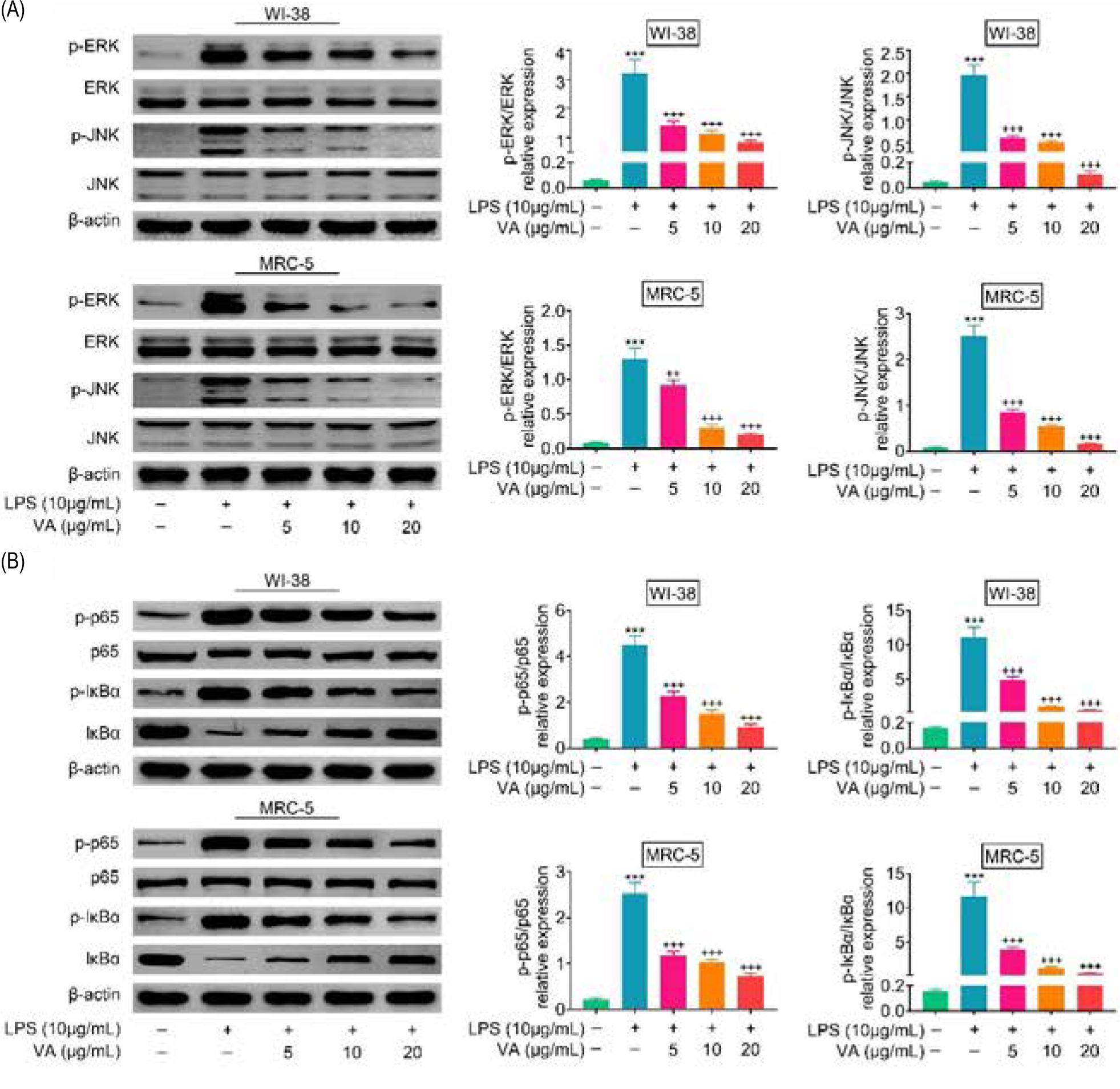 Figure 4. Vanillic acid suppressed activation of MAPK and NF-κB pathways. (A) Vanillic acid decreased p-JNK and p-ERK expression in a dosage-dependent manner. (B) Vanillic acid attenuated lipopolysaccharides-induced down-regulation of IκBα, and up-regulation of p-p65 and p-IκBα in WI-38 and MRC-5. +++, ***P < 0.001.