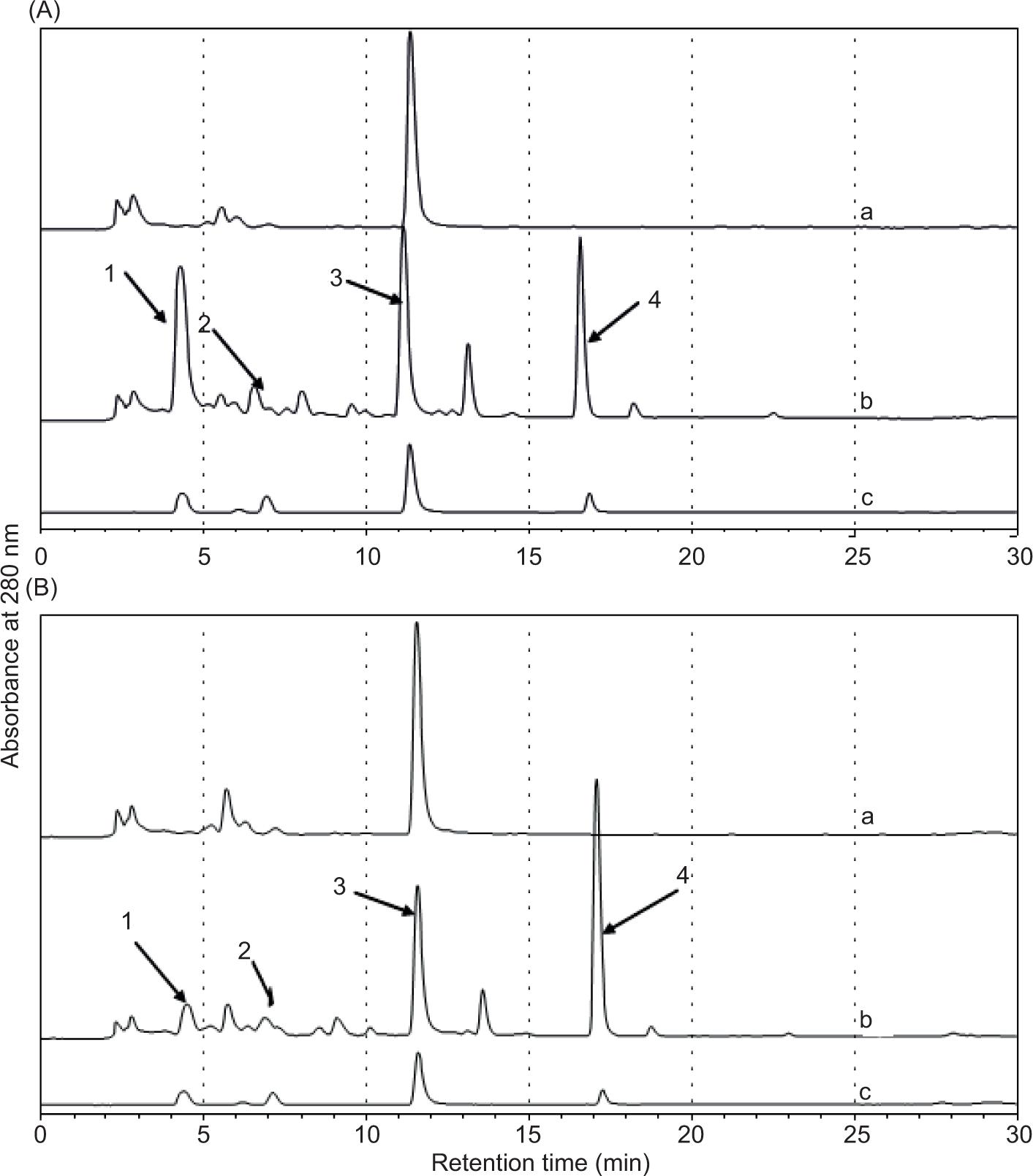 Figure 1. HPLC chromatogram of fermented solution from swine feces. (A) Feces of probiotic group and (B) feces of antibiotic group (1: 2-hydroxymethyl sesaminol-tetrahydrofuran (ST2); 2: sesaminol triglycoside (STG); 3: internal standard; 4: sesaminol. a: feces with phosphate buffer solution (PBS); b: feces with STG; c: standard containing ST-2, STG, hesperetin, and sesaminol).