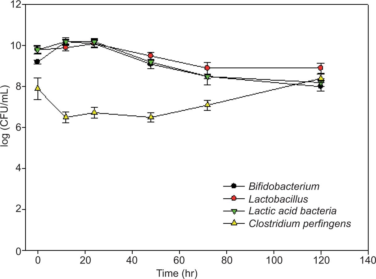 Table 6 shows changes in bacterial populations that occurred during the in vitro fermentation of STG at 12 h. Lactobacillus and Bifidobacterium counts were substantially higher in probiotic-fed swine feces than in antibiotic diet samples. Lactic acid bacteria counts were higher in probiotic diet samples whereas counts of Clostridium perfringens were higher in antibiotic diet samples, albeit neither difference was statistically significant. These findings suggest that a probiotic diet may enhance the growth of Lactobacillus and Bifidobacterium, compared to antibiotic diet. STG substantially increased the populations of Lactobacillus–Enterococcus and Bifidobacterium during in vitro fermentation with fecal microbiota, but it did not promote the development of Clostridium histolyticum, Eubacterium rectale–Clostridium coccoides, or Bacteroides–Prevotella (Zhu et al., 2013).