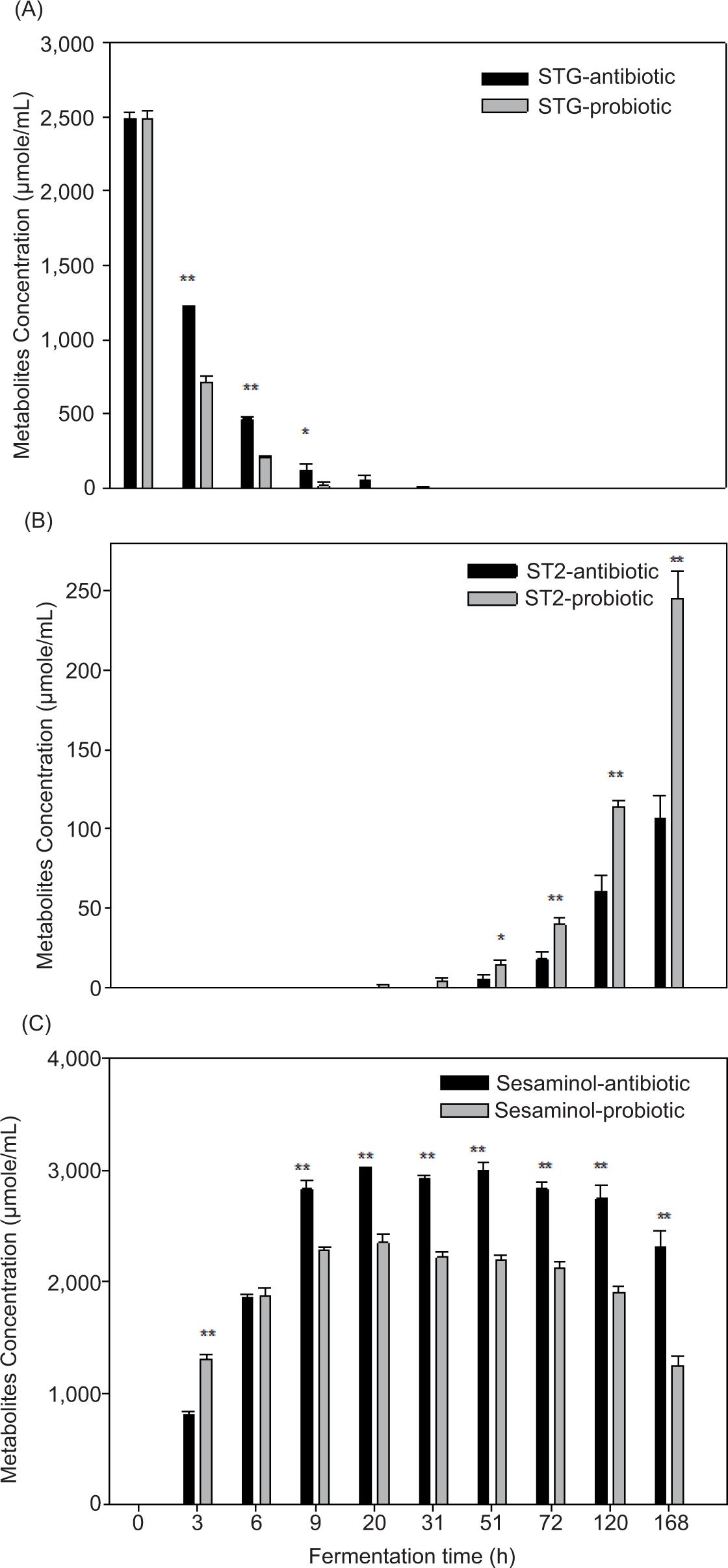 Figure 3. Biotransformation of sesaminol triglycoside (STG) to its metabolites in feces of probiotic- and antibiotic-fed swine. (A) STG, (B) sesaminol, and (C) ST-2 (*P < 0.05, **P < 0.01).