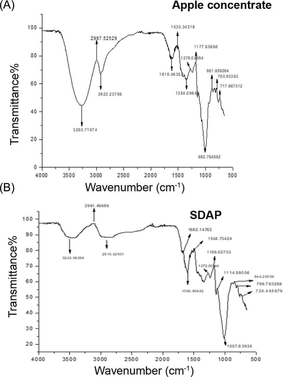 FTIR analysis was done to study the micromolecular composition of AJC and SDAP. FTIR spectra of AJC are shown in Figure 1A. The predominant absorption peak was observed at a frequency range of 3280 cm-1. Firdaus et al. (2017) also reported a maximum absorbance band at 3410 cm-1 for water extract of apple. Absorption bands from 3000 to 3500 cm-1 is the characteristic of vibrations due to hydrogen bonds and stretching of O–H bond between carbohydrates, carboxylic acids and residual water. The frequency range between 2850 and 3000 cm-1 corresponds to the C–H stretching linkages of sugars. Golubtsova (2017) also reported absorption bands at frequency of 2930 cm-1 for carbohydrate developed due to the valence resonance of CH2 groups. Bi-atomic linear chained molecules held in single plane vibrate at higher energy level thus give absorption peaks at higher frequency ranges while tri-atomic molecules having double or triple bonds or even single bonds and held out of the plane oscillate at lower energy level thus give absorption bands at lower frequency range (Khan et al., 2018). Peaks between frequency ranges of 1600–1695 cm-1 and 1500– 1585 cm-1 correlate with C=O stretching of amides and α-CH2 bending and C=O stretching of carboxylic acids and esters, respectively. Anthocyanins, major colouring pigment in AJC, give absorption bands between 1250 and 1380 cm-1. Peak shown in the frequency range of 1060–1170 cm-1 is due to stretching fluctuations of C–O bonds of sugars and organic acids. Phenols, a group of bioactive compounds that define the therapeutic value of plants, are known to absorb frequencies in the range of 1270–1140 cm-1. The frequency range of 1100–1000 cm-1 is mainly due to vibrations of C–O–H group present in primary and secondary alcohols. Alcohols, found in copious amount in fruits, are the main flavouring elements in AJC. Absorption peak obtained in the frequency range of 880–1010 cm-1 is the characteristic of =CH and =CH2 bending while peak between 780 and 846 cm-1 is assigned to CH bending and ring puckering.