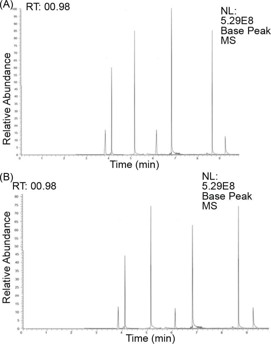 Figure 3. GC chromatogram revealing major flavouring compounds in (A) AJC and (B) SDAP.