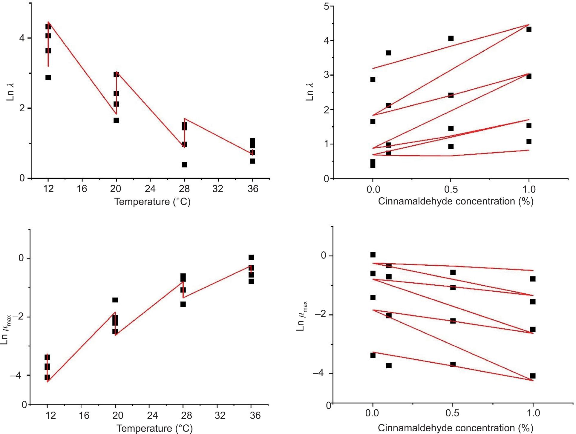 Figure 2. Fitting diagram of temperature and cinnamaldehyde concentration with the lag time (Ln λ) and maximum specific growth rate (Ln μmax) of Bacillus cereus spores in boiled ready-to-eat beef.