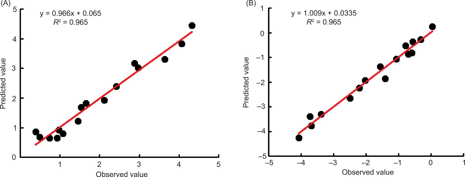 As shown in Table 2, both the models had an acceptable goodness because the RMSE values were 0.230 and 0.203 for Ln λ and Ln µmax, respectively. The R2 values respectively were 0.965 and 0.974 (Figure 3), suggesting both equations have a satisfactory correlation between the experimental data and regression model predictions for the dependent variable of B. cereus growth. The Af values were 1.185 and 1.291 for Ln λ and Ln µmax, respectively, suggesting the predicted data were acceptably close to the experimental data. The Bf values were 1.023 and 1.086, indicating the predictions were within an acceptable range in this study (Nyhan et al., 2018).