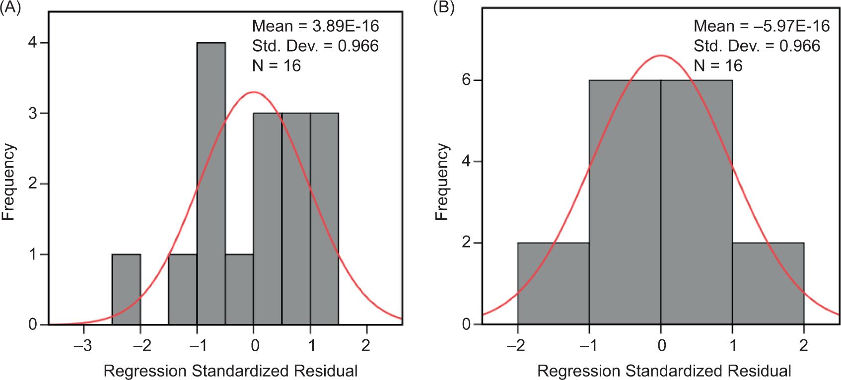 Figure 4. Histogram of residual distribution of Ln λ (A) and Ln μmax (B).