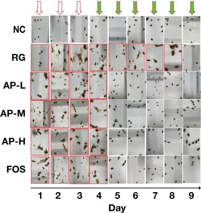 Figure 1. State of mouse feces. NC, normal group; RG, model group; AP-L, low dose of Antrodia cinnamomea intracellular polysaccharide treatment group; AP-M, middle dose of Antrodia cinnamomea intracellular polysaccharide treatment group; AP-H, high dose of Antrodia cinnamomea intracellular polysaccharide treatment group; FOS, FOS positive-control group. The red hollow arrow indicates the period of intragastric feeding of LIH. The green arrow indicates the intragastric feeding after drug withdrawal. The red box indicates the abnormal feces of mice (diarrhea). The feces of all mice returned to normal after 9 days.