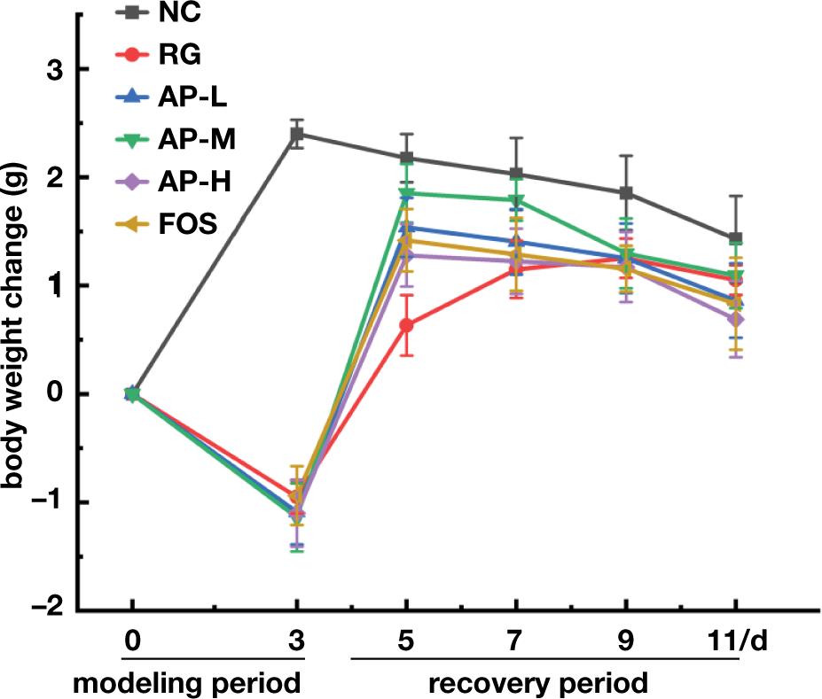 On days 1–3, compared with mice in the NC group, the bodyweight of mice intragastrically fed with LIH significantly decreased, indicating that LIH negatively affected mouse growth. After the medication was discontinued (4–7 days), the bodyweight of the mice gradually increased, but the AP-M group showed greatly higher recovery and growth rates and body weight than the RG group (Figure 2). This outcome indicated that the intragastric administration of AIPSs was beneficial in improving the body-weight loss caused by LIH, and the effect was equivalent to that of FOS. After 7 days, the weight growth of all groups stabilized.