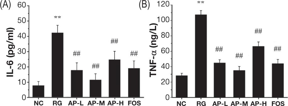 The inflammatory factors in mouse serum were assessed by detecting the degrees of IL-6 and TNF-α (Figure 3). The RG group showed greatly higher levels of these two factors in sera than the NC group (P<0.01), suggesting that LIH could lead to severe inflammatory symptoms in mice. The degrees of IL-6 and TNF-α in the sera of mice intragastrically fed with AIPSs and FOS were significantly lower than those in the RG group (P<0.01). This result implied that AIPSs benefited the treatment or alleviation of the inflammatory symptoms caused by LIH, and the effect of the middle dose of AIPSs was even better than that of FOS.