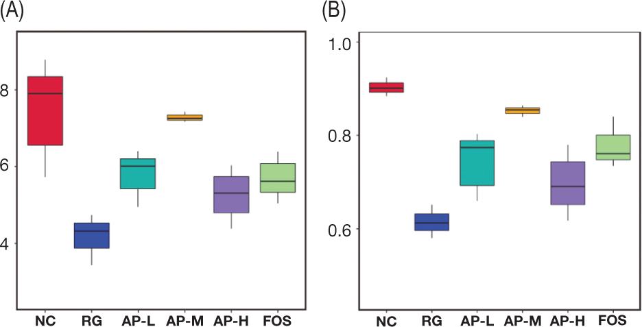Figure 4. Shannon (A) and Simpson (B) indices of the α-diversity analysis of intestinal microbiota.