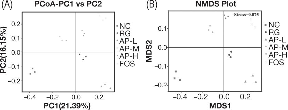 Figure 5. β-Diversity analyses of intestinal microbiota. (A) principal coordinate analysis (PCoA); (B) non-metric multidimensional scaling (NMDS) analysis.