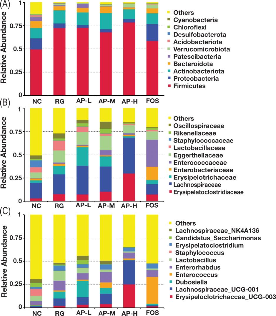 To intuitively observe species with high relative abundance at various classification levels and their proportions in intestinal floras of the different groups, column diagrams of microorganisms with the highest abundance ranking (top 10) at the phylum level (Figure 6A), family level (Figure 6B), and genus level (Figure 6C) were constructed based on the species annotation and abundance information of every sample at the genus level. The outcomes displayed that at the phylum level, Firmicutes, Proteobacteria, and Actinobacteriota were the main floras. Their proportions were approximately 90% of the total flora. Bacteroidota accounted for 5% of the total flora. At the family and genus levels, Erysipelatoclostridiaceae, Lachnospiraceae, Erysipelotrichaceae, Enterobacteriaceae, and Enterococcaceae were the main dominant floras. Their proportions were approximately 55% of the total flora. The relative abundance of Erysipelotrichaceae_UCG-003, a beneficial bacterium, was also significantly higher in the intestinal flora of the AP-H group than that of the NC group. In addition, the relative abundance of the probiotic Lachnospiraceae_UCG-001 in the intestinal flora of the AP-M and AP-H groups was also significantly higher than that of the RG group.