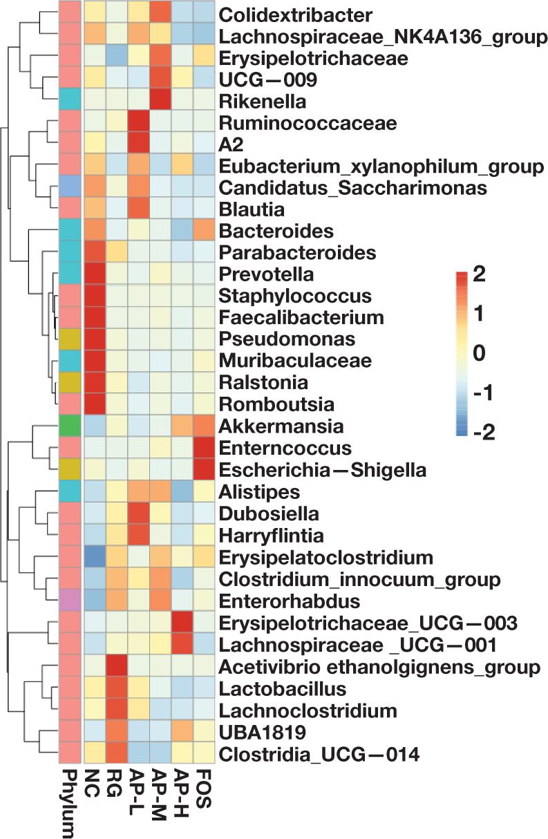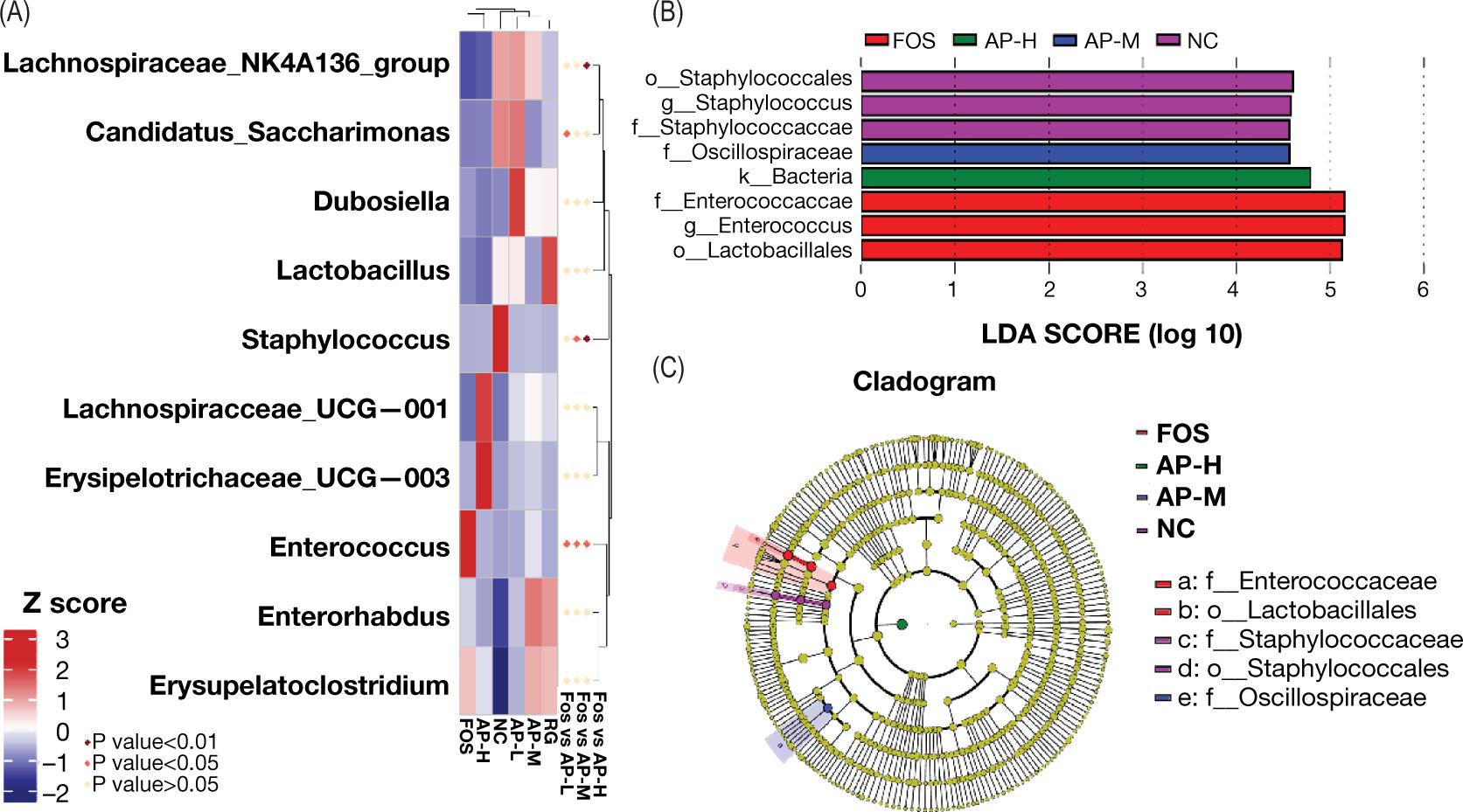 Figure 8. Analysis of significant differences in intestinal flora structure among treatment groups. (A) Analysis of MetaStat heatmap. Z score represents the species aggregation degree, and the P value represents the level of significant differences. P<0.05 represents that the difference is significant, and P < 0.01 represents that the difference is extremely significant. (B) An LDA distribution histogram was used to analyze the microbial species with the significant difference among the AP-M, AP-H, FOS, and NC groups. (C) An evolutionary branching diagram to compare the AP-M, AP-H, FOS, and NC groups. The large circles from the interior to the exterior refer to classifying species from the phylum to the genus/species. The size of each node circle refers to the relative abundance of species. If the circle is larger, the relative abundance is higher.