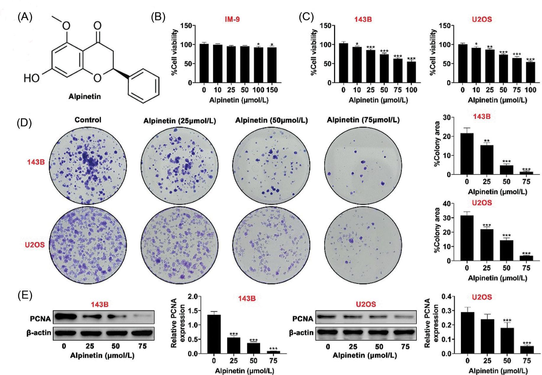 Figure 1. Alpinetin reduced cell proliferation of osteosarcoma. (A) Chemical structure of alpinetin. (B) Treatment with alpinetin reduced the viability of IM-9 cell line, detected by CCK8 assay. (C) Treatment with alpinetin decreased the viabilities of 143B and U2OS cell lines in a dosage-dependent manner, detected by CCK8 assay. (D) Treatment with alpinetin decreased the proliferation of 143B and U2OS cell lines, detected by colony formation assay. (E) Treatment with alpinetin decreased the protein expression of PCNA in 143B and U2OS cell lines. *P < 0.05, **P < 0.01, ***P < 0.001.