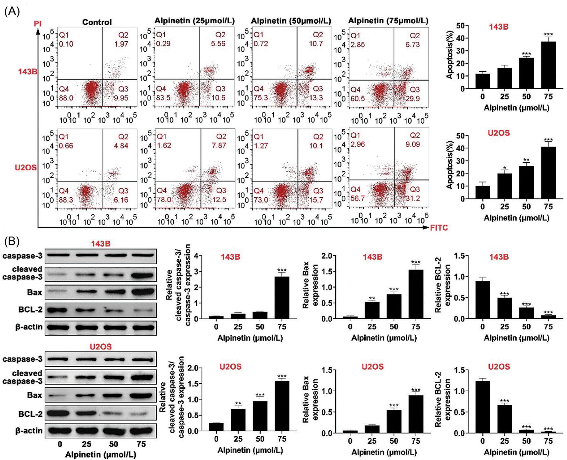 Figure 2. Alpinetin promoted cell apoptosis of osteosarcoma. (A) Treatment with alpinetin promoted the apoptosis of 143B and U2OS cell lines in a dosage-dependent manner, detected by flow cytometry assay. (B) Treatment with alpinetin down-regulated Bcl-2, up-regulated cleaved caspase-3 and Bax of 143B and U2OS cell lines in a dosage-dependent manner. **P < 0.01, ***P < 0.001.