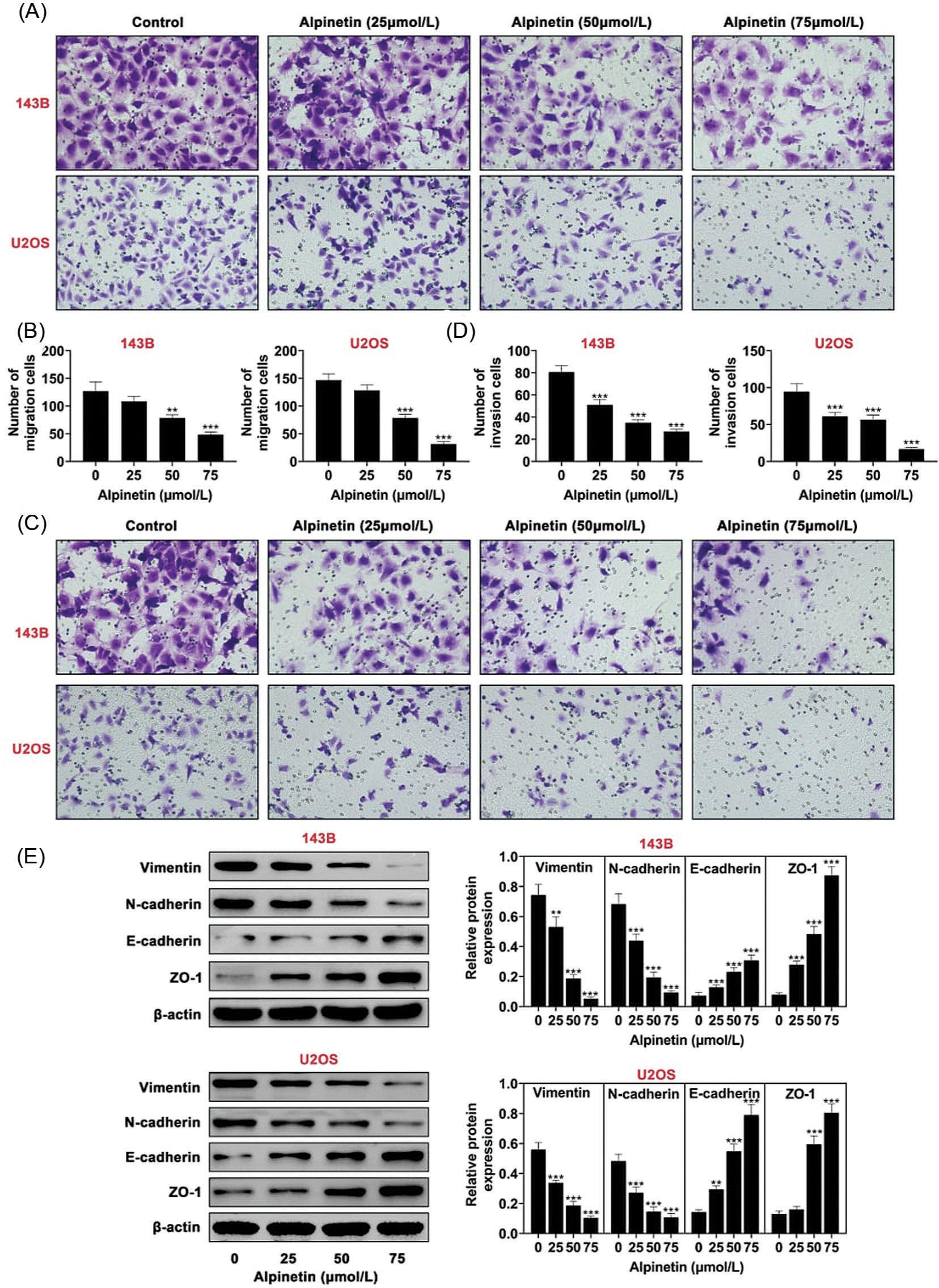 Figure 3. Alpinetin reduced cell metastasis of osteosarcoma. (A) Alpinetin inhibited cell migration of 143B and U2OS cell lines in a dosage-dependent manner detected by transwell assay. (B) Alpinetin inhibited cell invasion of 143B and U2OS in a dosage-dependent manner detected by transwell assay. (C) Alpinetin inhibited decreased protein expression of vimentin and N-cadherin, increased E-cadherin and ZO-1 of 143B and U2OS cell lines in a dosage-dependent manner. **P < 0.01, ***P < 0.001.
