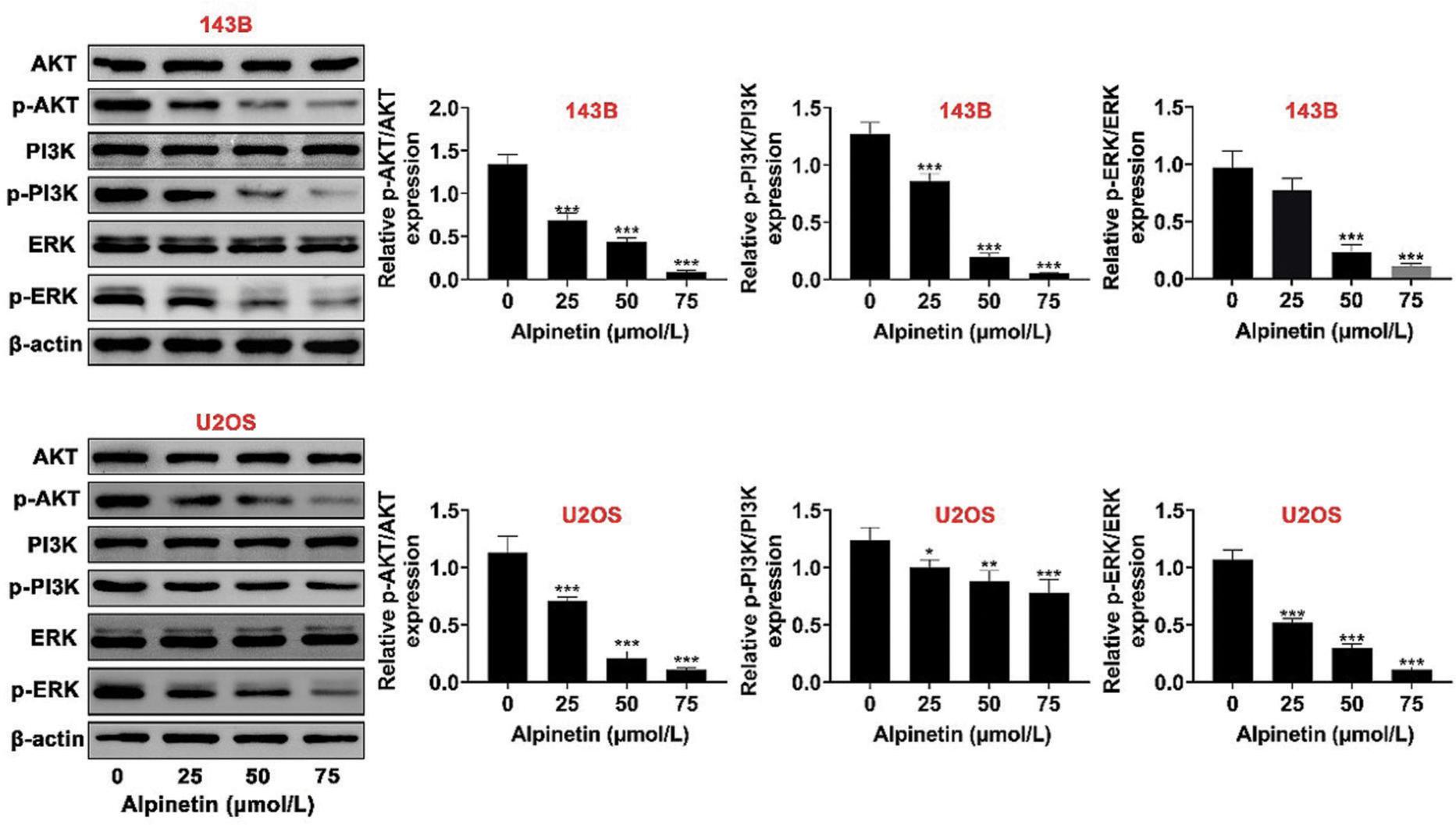 Figure 4. Alpinetin suppressed PI3K/AKT and ERK signaling in osteosarcoma. Alpinetin down-regulated p-ERK, p-AKT, and p-PI3K of 143B and U2OS cell lines in a dosage-dependent manner. *P < 0.05, **P < 0.01, ***P < 0.001.