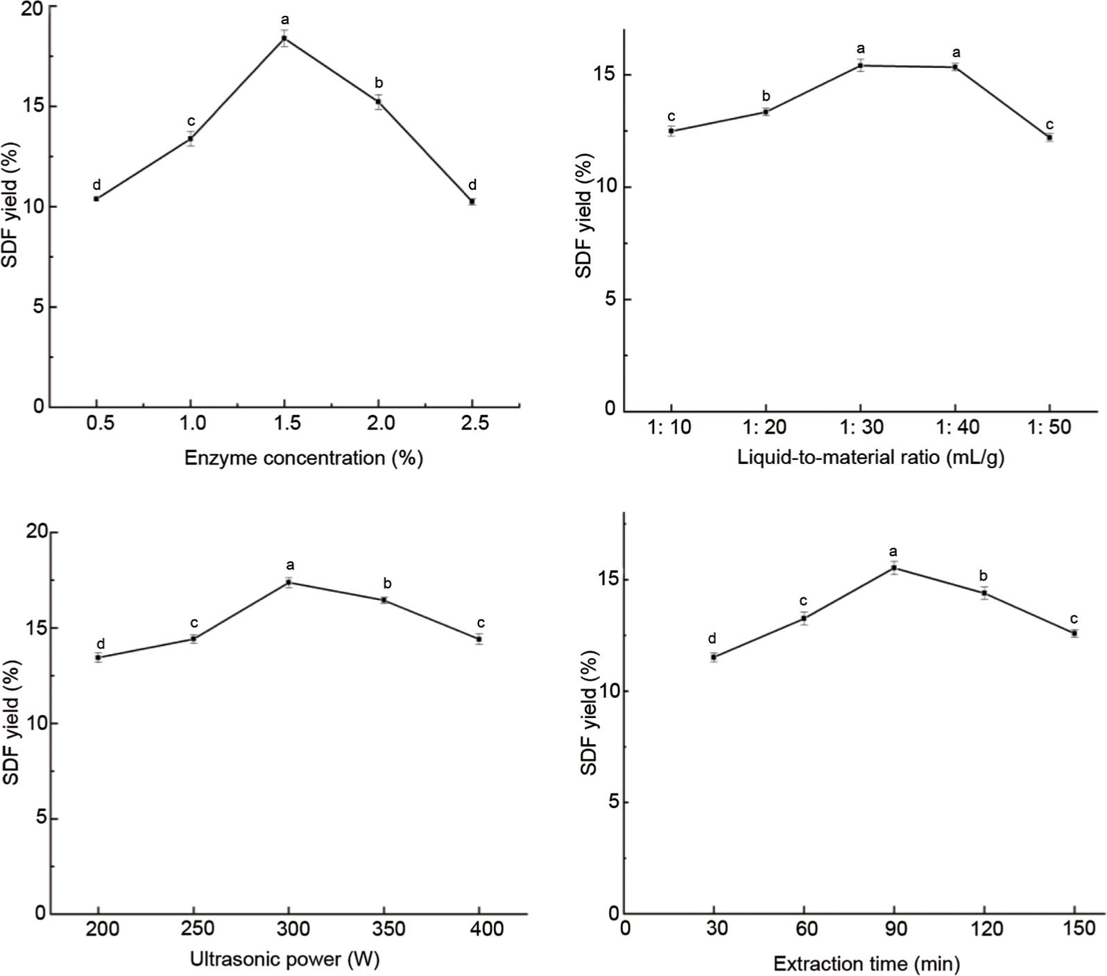 Figure 1. Effect of enzyme concentration, liquid-to-material ratio, ultrasonic power, and extraction time on the yield of FCBSDF. Different letters under the same index indicate significant difference (P < 0.05).