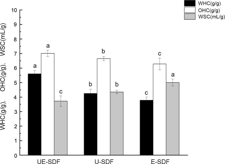 Figure 2. Effects of different extraction methods on WHC, OHC, and WSC of FCB-SDF.
