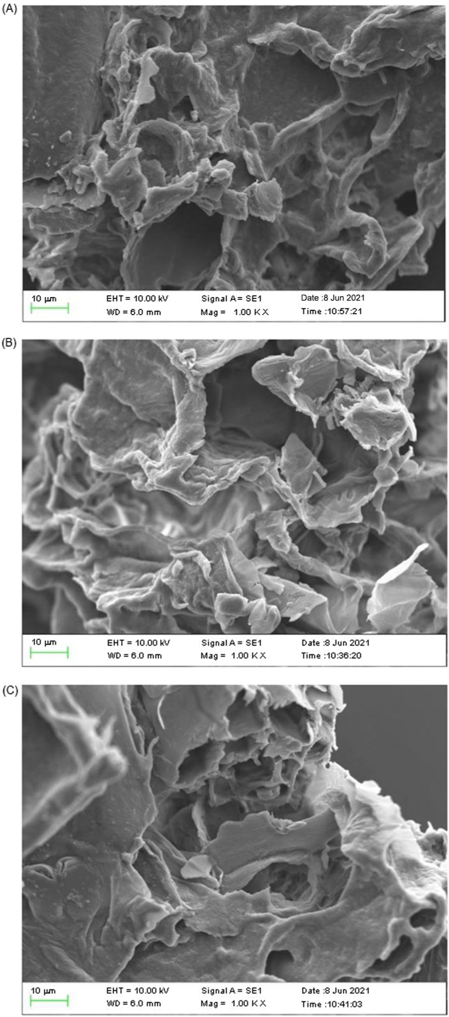 Figure 3. Effect of different extraction methods on the microstructure of FCB-SDF (× 1000 times). A: U –SDF; B: UE –SDF; C: E– SDF.