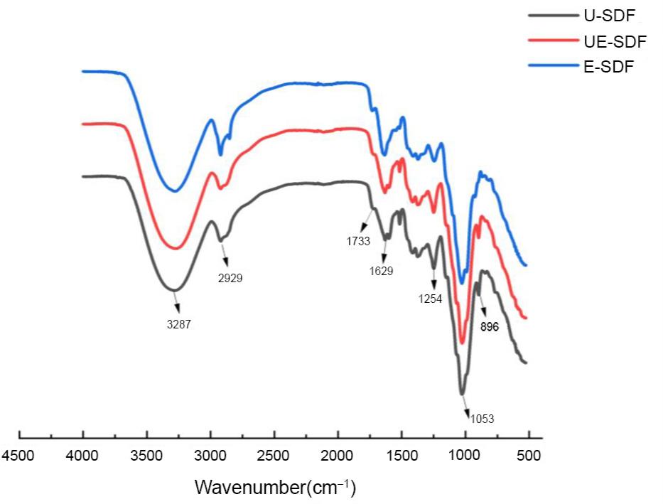 As seen in Figure 4, the absorption peak at 3287 cm‒1 corresponded to the stretching of the hydrogen-oxygen bond (‒OH), which was mainly derived from pectin (galacturonic acid) and hemicellulose (xylose, mannose, galactose, and arabinose) (Wu et al., 2021; Zhang et al., 2017). Compared with E-SDF, the absorption peak intensities of the two SDFs were increased by ultrasonic treatment, which indicated that the two SDFs had more hydrogen bonds in the associated state (Li et al., 2019). The absorption band at 2929 cm‒1 came from the vibration of the C-H bond (including C-H, C-H2, and C-H3), especially the stretching vibration of the methyl ester methyl group (CH3), which was a typical structural absorption peak of polysaccharide compounds (Xu et al., 2015). The decrease or disappearance of the SDF peak intensity indicated that the extraction of SDF by enzymatic hydrolysis caused the partial degradation of methyl and methylene in the polysaccharide (Zhang et al., 2021). The main absorption at 1733 cm‒1 corresponded to the stretching of the carbonyl group, indicating that more carbonyl groups and esters were formed in U-SDF. The absorption at 1629 cm‒1 was due to the stretching of the carboxyl group, which was also a manifestation of the presence of crystal water in the sugar (Kan et al., 2021). The two peaks of carbonyl and carboxyl were the typical bonds for calculating the methoxy content of pectin, which indicated that U-SDF contained more pectin. The peak area was at 1200 cm‒1 to 1420 cm‒1, reflecting the variable angle vibration of hydrocarbons (Xu et al., 2015). The absorption peak at 1254 cm‒1 proved the presence of ester groups in pectin. Polysaccharides had typical absorption peaks in the range of 950 cm‒1 to 1200 cm‒1, and the absorbance around 1053 cm‒1 indicated the presence of a pyran ring structure in the molecule (Xu et al., 2015), namely, SDF was composed of pyranose monosaccharides. The absorption peak at 896 cm‒1 was caused by D-glucopyranose (Mamun, 2005). Therefore, the three SDFs might be mainly composed of pectin and hemi-cellulose, E-SDF and UE-SDF might contain more hemicellulose, and U-SDF contained more pectin.