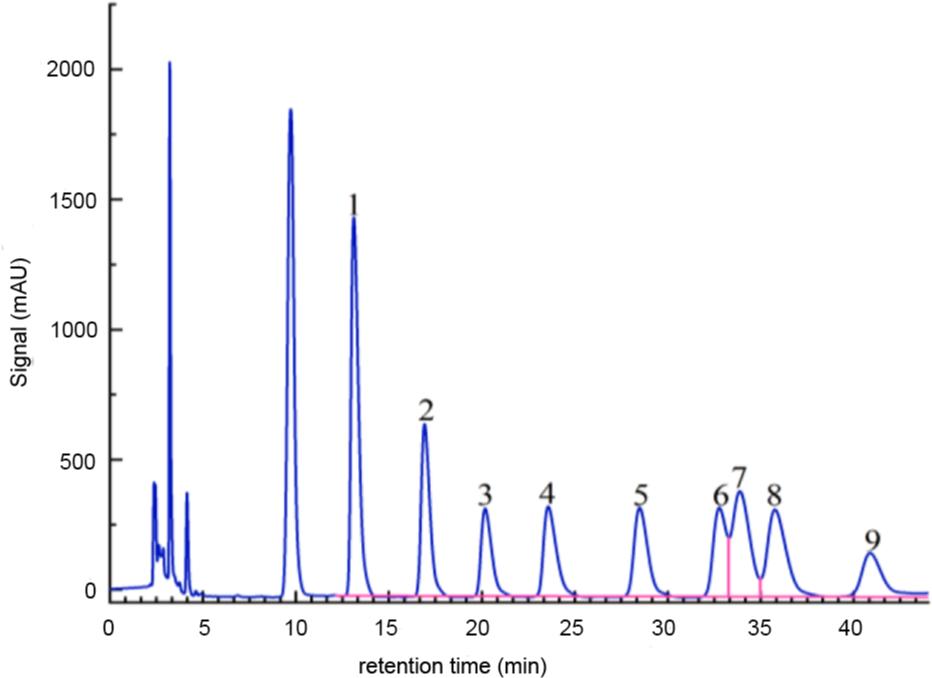 Liquid chromatogram of monosaccharide standards. 1-Mannose, 2-Ribose, 3-Glucuronic acid, 4-Galacturonic acid, 5-Glucose 6-Galactose, 7-Xylose, 8-Arabinose, 9-Fucose.