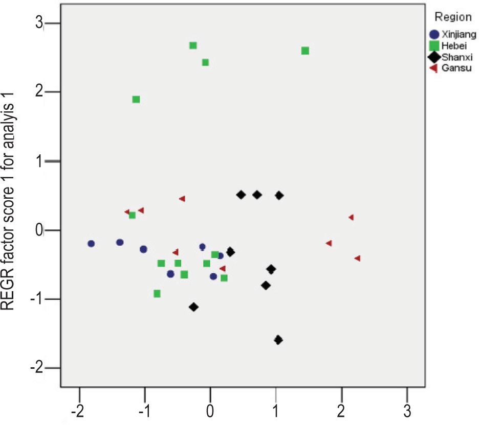 Using the standardized scores of the first and second principal components as a scatter plot (Figure 1), the results showed that Xinjiang, Hebei, Shanxi and Gansu provinces overlapped each other, and neither these could be clearly separated nor could be the origin of red jujube clearly identified.