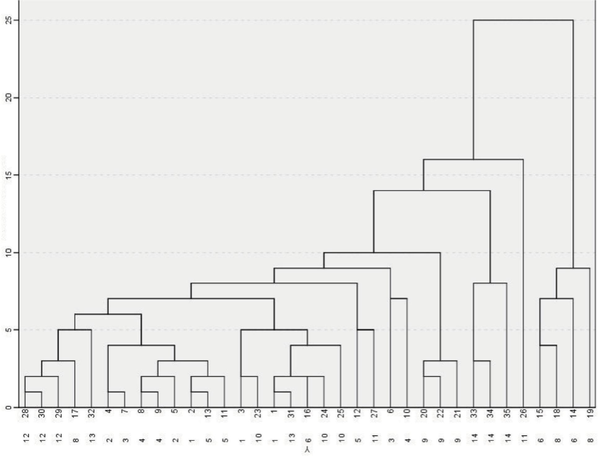 In Figure 2, the first column of the ordinate represented the red jujube sample, 1–7 represented Xinjiang province, 8–19 represented Hebei province, 20–26 represented Shanxi province and 27–34 represented Gansu province. The second column of the ordinate represented four regions, 1–3 represented Xinjiang province, 4–8 represented Hebei province, 9–11 represented Shanxi province and 12–14 represented Gansu province. The abscissa represented the distance scale of clustering analysis.