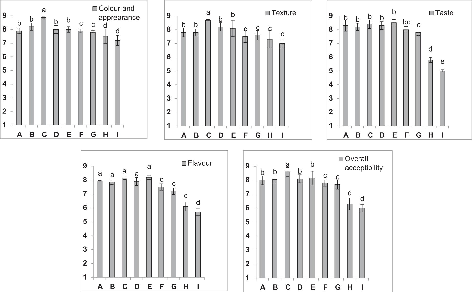 Figure 1. Sensory characteristics of cookies. *A (Control), B (AP1 2.5%), C (AP15%), D (AP1 7.5%), E (AP1 10%), F (DP1 2.5%), G (DP15%), H (DP1 7.5%), I (DP1 10%). API, Alfalfa protein isolate; DPI, Dhaincha protein isolate. *Values are expressed as mean and error bars represent standard deviation (n = 100). * The means with different superscripts are significantly different at P < 0.05.