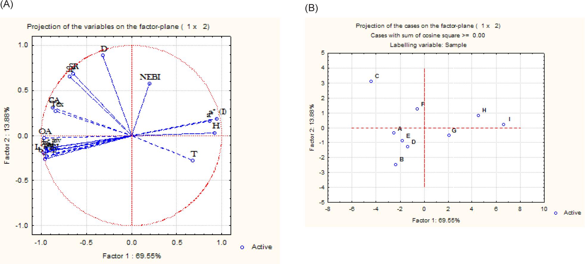 The principal component analysis for the quality characteristics of cookies is presented in Figure 2. The quality characteristics in the same quadrants of loading plot (Figure 2A) are positively correlated whereas the quality characteristics in the opposite quadrants represent a negative correlation. The thickness (T) was negatively correlated with SR whereas diameter (D) was positively correlated. The non-enzymatic browning index (NEBI) was positively correlated with a* value of the cookies. Hardness (H) and non-enzymatic browning index (NEBI) also showed a negative correlation with the overall acceptability score (OA). The score plot (Figure 2B) represents the variation in the cookies sample as a result of incorporation with API and DPI. Sample E (API 10%), D (API 7.5%), B (API 2.5%) showed high similarity to the control sample (A) whereas variation in sample C (API 5%) was attributed to higher spreading in comparison to the aforesaid samples. The samples incorporated with DPI showed high variability between them and sample G (5% DPI) was most similar to the control sample (A).