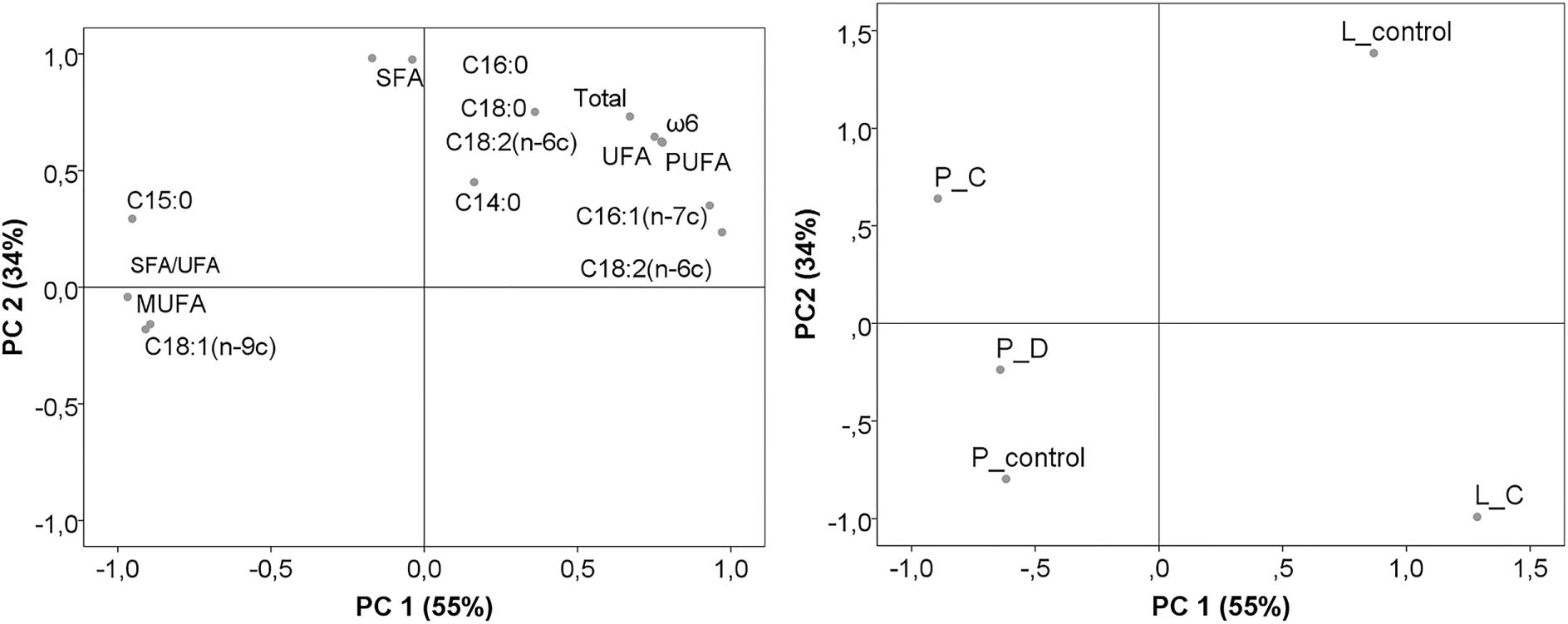 Figure 1. Scattering the data of fatty acids and lipid indices by the first two principal components (PC1 and PC2) analysis of fungi grow on brewery by-products. (A) Biplot of the first two components created, considering fatty acids and lipid indices; (B) Rotated principal scores of fungi and their corresponding substrates projected into the first two principal components. P_control: P. ostreatus grown on the control substrate; P_C: P. ostreatus grown on C substrate; P_D: P. ostreatus grown on D substrate; L_control: L. edodes grown on control substrate; L_C: L. edodes grown on C substrate.