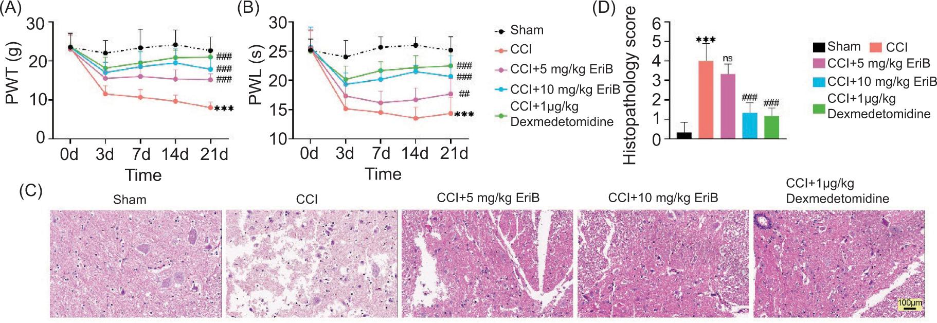 Figure 1. EriB relieved CCI-stimulated neuropathic pain and nerve damage. Mice were divided into sham, CCI, CCI+5-mg/kg EriB, CCI+10-mg/kg EriB, CCI+1-μg/kg dexmedetomidine groups. (A) PWT was observed through mechanical allodynia test. (B) PWL was examined through thermal hyperalgesia test. (C) Spinal injury was assessed through H&E staining. (D) Histopathology score was also verified. ***P < 0.001 vs the sham group; ##P < 0.01, ###P < 0.001 vs the CCI group.