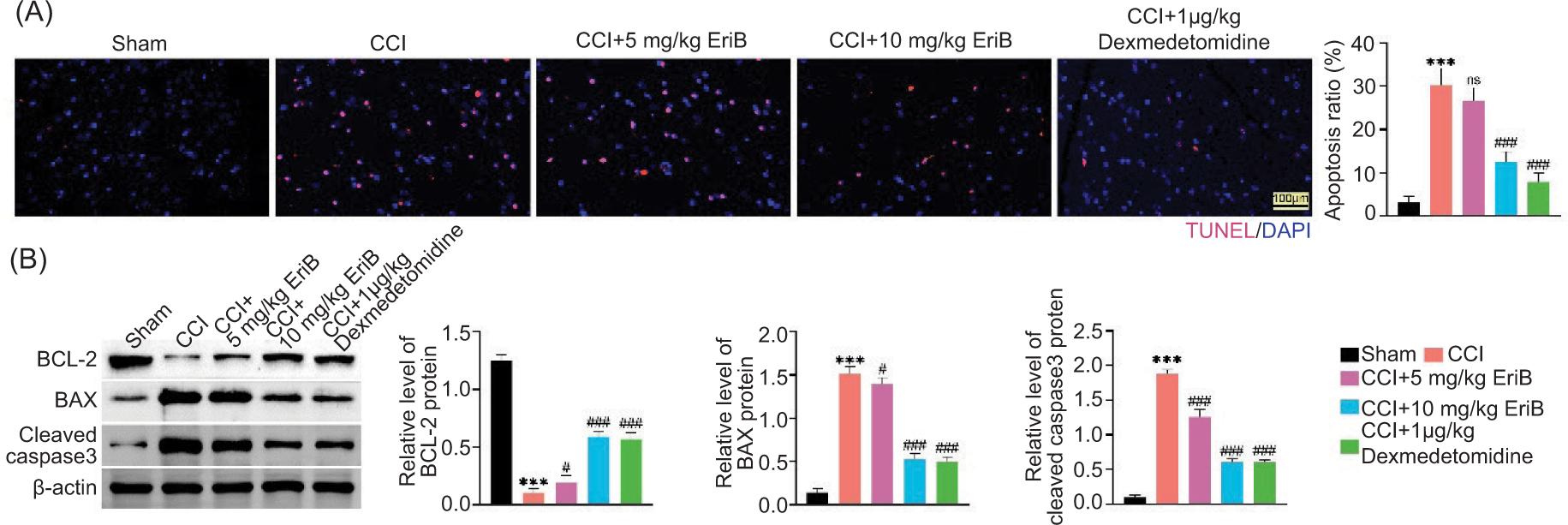 Figure 2. EriB suppressed CCI-mediated neural apoptosis. Mice were divided into sham, CCI, CCI+5-mg/kg EriB, CCI+10-mg/kg EriB, and CCI+1-μg/kg dexmedetomidine groups. (A) Cell apoptosis in the spinal cord was measured by TUNEL assay. (B) The protein expressions of BCL-2, BAX, and Cleaved caspase-3 were assessed by Western blot analysis. ***P < 0.001 vs the sham group; #P < 0.05, ###P < 0.001 vs the CCI group.