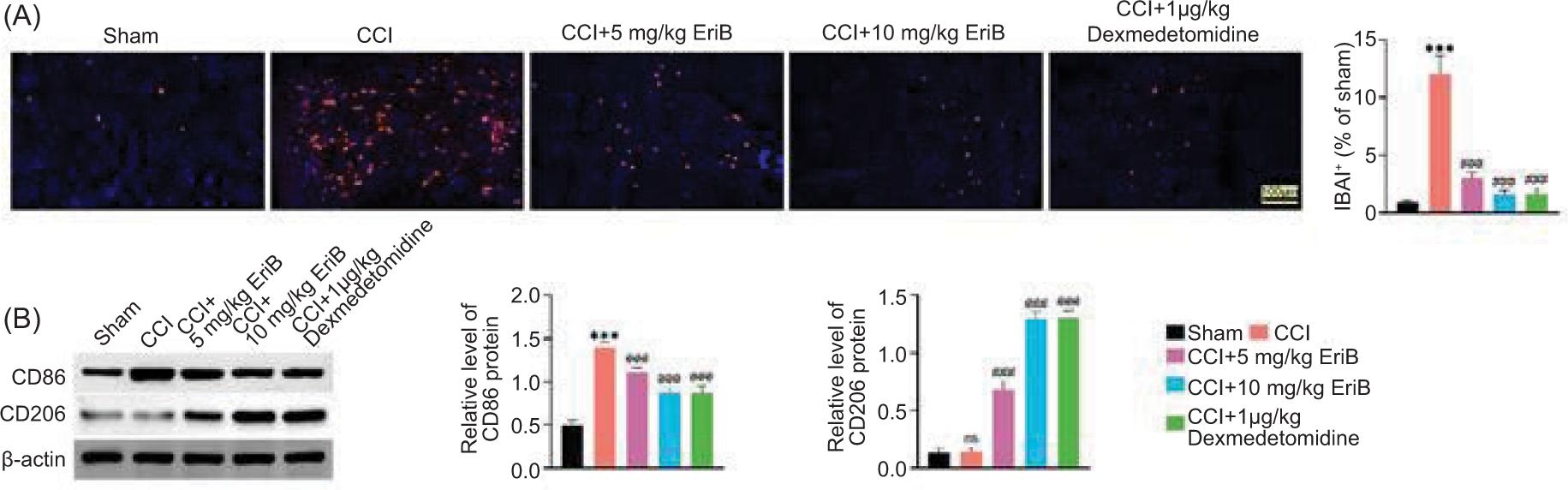 Figure 3. EriB inhibited CCI-induced microglia activity. Mice were divided into sham, CCI, CCI+5-mg/kg EriB, CCI+10-mg/kg EriB, and CCI+1-μg/kg dexmedetomidine groups. (A) IBA1 level in the spinal cord was evaluated through immunofluorescence assay. (B) The protein expressions of CD86 and CD206 were assessed by Western blot analysis. ***P < 0.001 vs the sham group; ###P < 0.001 vs the CCI group.