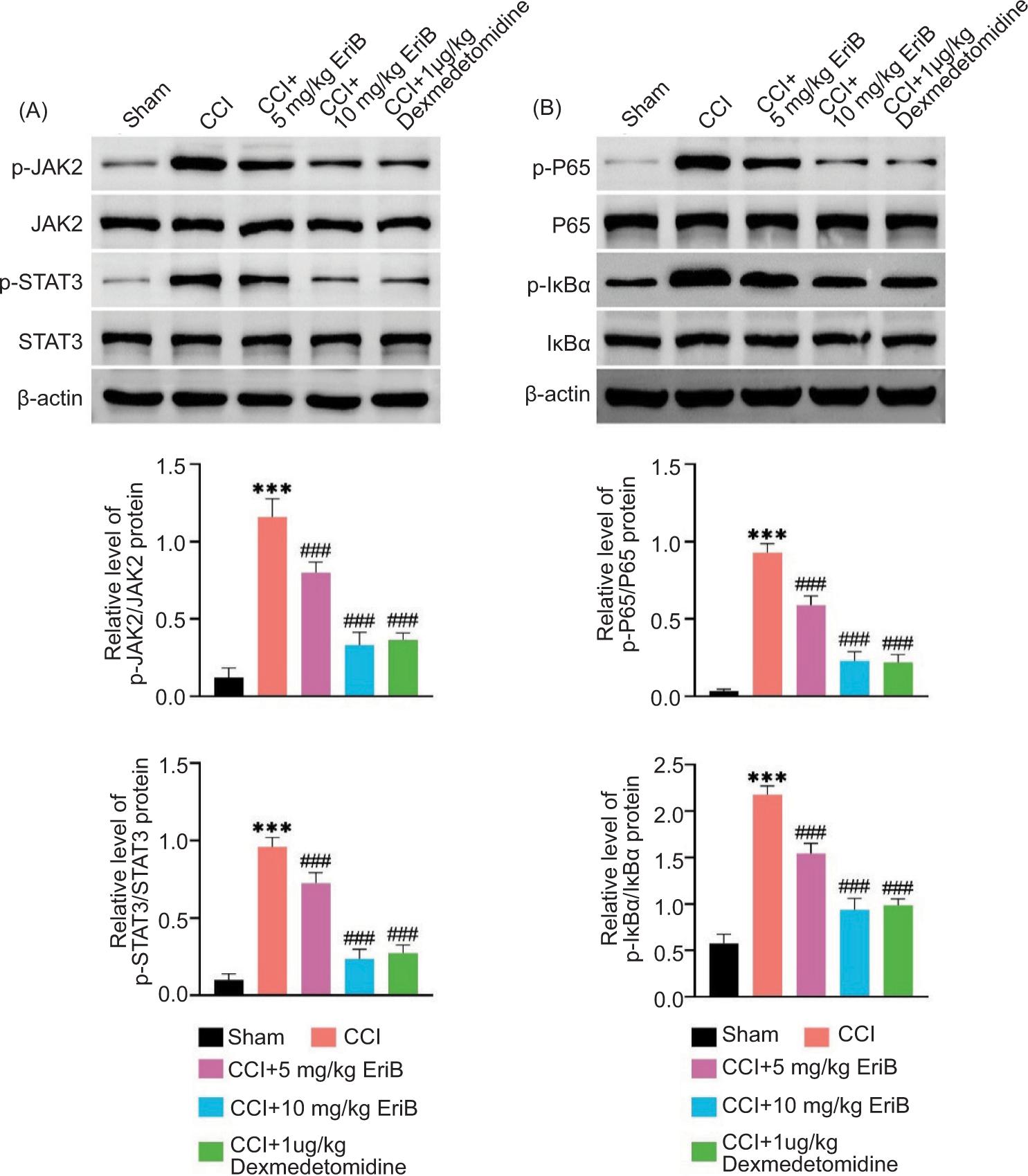 Figure 5. EriB retarded JAK2/STAT3 and NF-κB pathways. Mice were divided into sham, CCI, CCI+5-mg/kg EriB, CCI+10-mg/kg EriB, and CCI+1-μg/kg dexmedetomidine groups. (A) The protein expressions of p-JAK2, JAK2, p-STAT3, and STAT3 were assessed by Western blot analysis. (B) The protein expressions of p-P65, P65, p-IκBα, and IκBα were evaluated by Western blot analysis. ***P < 0.001 vs the sham group; ###P < 0.001 vs the CCI group.
