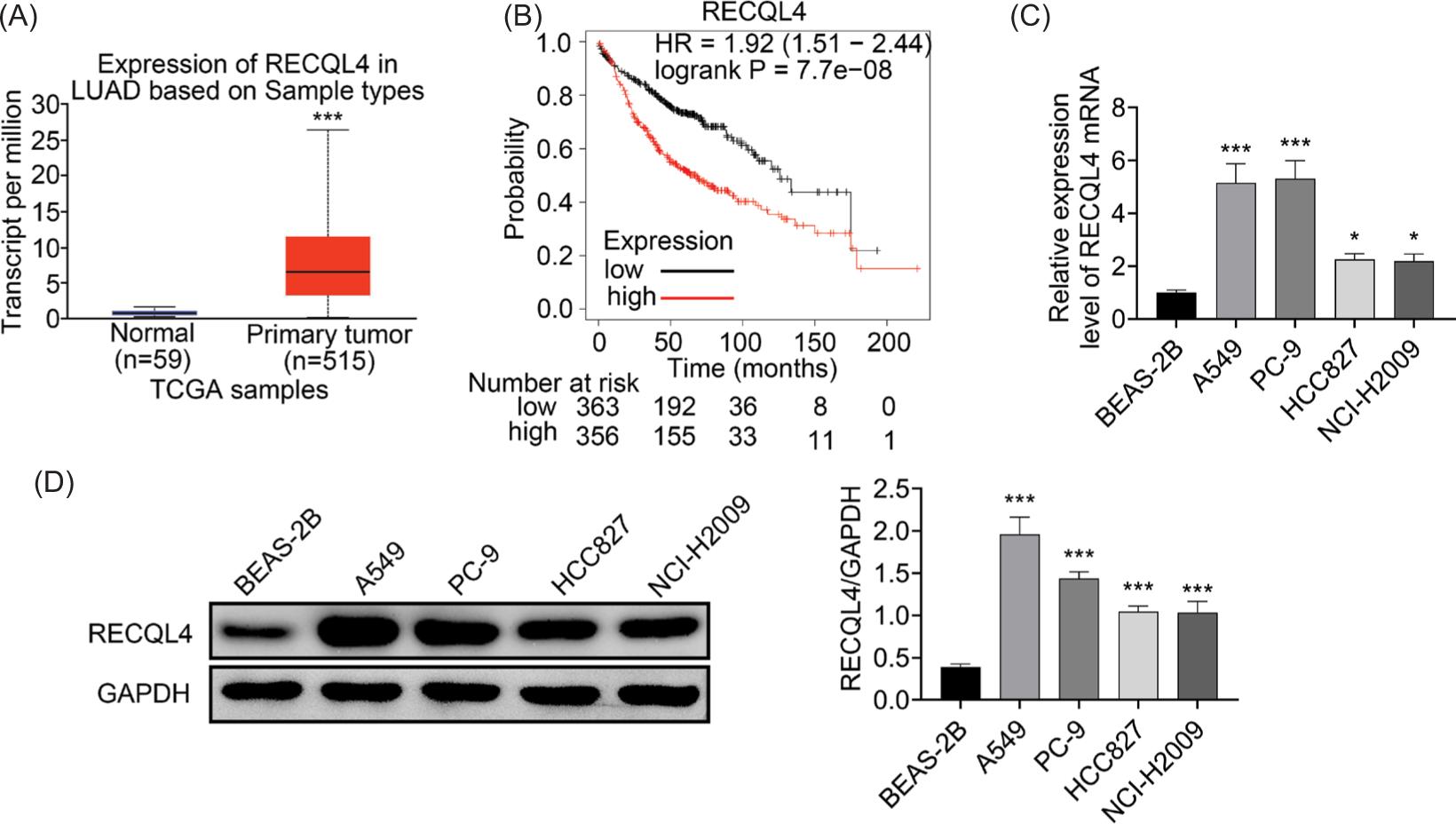 Figure 1 RECQL4 exhibited higher expression in LUAC. (A) The expression of RECQL4 in LUAC was assessed by TCGA database. (B) The survival rate of LUAC patients with low or high RECQL4 expression was evaluated through Kaplan–Meier plotter database. (C) The mRNA expression of RECQL4 was tested through RT-qPCR in LUAC cell lines (A549, PC-9, HCC827, and NCI-H2009) and the normal lung epithelial cells (BEAS-2B). (D) The protein expression of RECQL4 was tested by Western blot analysis. *P < 0.05, ***P < 0.001.