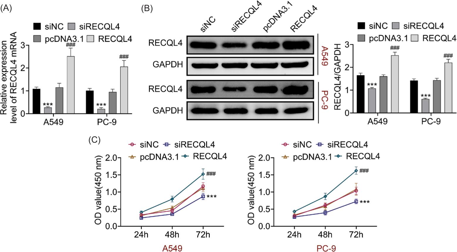 Figure 2 RECQL4 enhanced cell proliferation. (A,B) The knockdown and overexpression efficiency of RECQL4 in A549 and PC-9 cells were verified through RT-qPCR and Western blot analysis. (C) The cell proliferation was measured after silencing or up-regulating RECQL4 through CCK-8 assay. *P < 0.05, ***P < 0.001 vs siNC; ###P < 0.001 vs pcDNA3.1. NC: negative control.